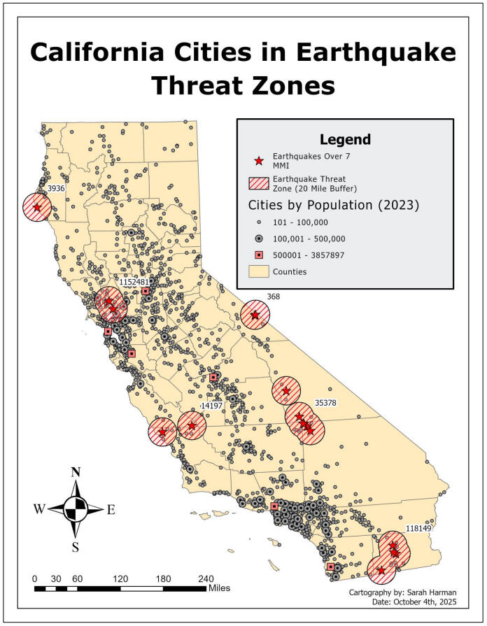 This map analyzes the spatial relationship between California’s major population centers and areas of high seismic risk by mapping historical earthquakes over 7 MMI, generating 20-mile buffer zones around epicenters, and performing a spatial join to identify cities and populations located within these earthquake threat zones. This project utilizes demographic data and county boundaries to visualize population exposure and geographic vulnerability across the state.