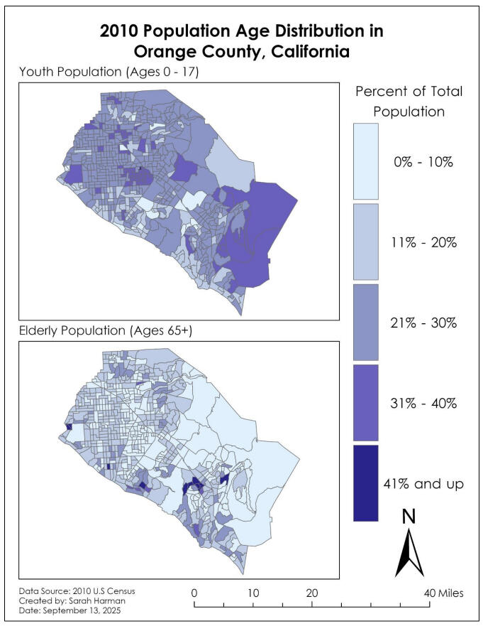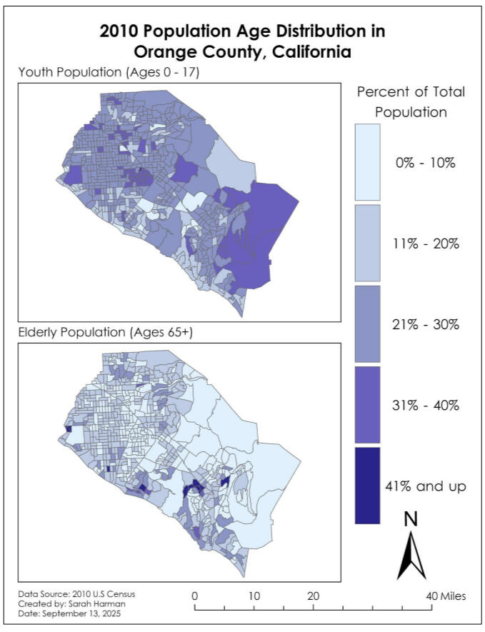 Created a dual choropleth map illustrating the spatial distribution of youth (ages 0–17) and elderly (ages 65+) populations in Orange County, California, using 2010 U.S. Census data. The map classifies census tracts by the percentage of each age group to compare patterns of generational concentration across the county.Impact: