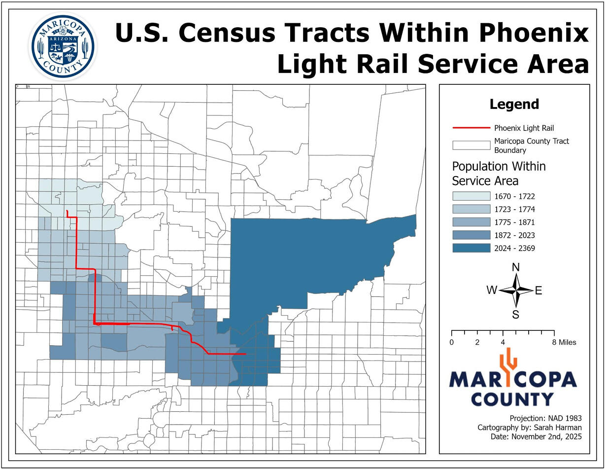 Used a 2-mile buffer around the Phoenix light rail line to identify intersecting 2010 census tracts and calculate the total and average populations within the light rail service area. Represented tract-level populations using a graduated color scheme to visualize density patterns relative to transit accessibility.Impact: