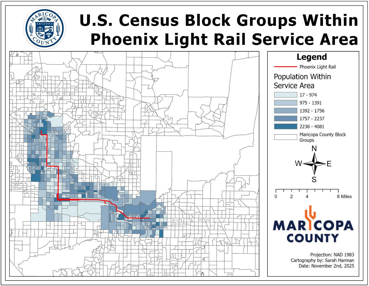 Designed a cartographically clear population density map for Phoenix’s light rail service area.